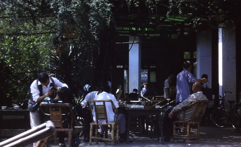En miljö jag tyckte väldigt mycket om var tehusen, men det skulle vara de enklare, mer genuina tehusen. Det fanns ett alldeles intill universitetsområdet dit jag gick flera gånger. För att komma in i tehuset fick man gå över en liten brygga, under den var en öppen kloak, så det doftade inte direkt. Väl inne i tehuset var det mycket enkelt men komplett med fåglar i burar, som jag hade sett på bild många gånger. Så fanns det ”öronrensaren”, en man som med ett metallinstrument rensade öronen på folk. Jag testade inte det. Något av mera modernt snitt som fanns i alla tehus vi besökte var en TV-apparat i ett hörn, för det mesta med sportprogram på. Man drack te i koppar med lock. När man kom in fick man teblad i botten av koppen som sedan fylldes på med varmt vatten så det gällde att sila tebladen mellan tänderna när man drack. Man kunde markera med hur man la locket om man ville ha mera vatten, en i personalen gick omkring bland gästerna med en kanna med kokande vatten och fyllde på ibland. Om man la locket på koppen markerade det att man inte ville ha mera vatten.