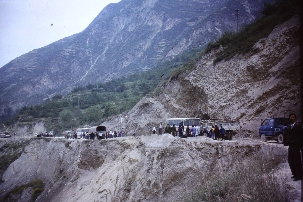 Efter några timmars färd blev det stopp. Vägen följde en bergssida och en bit av vägbanan hade rasar ner. Det kan inte ha varit någon särskilt hård bergart eftersom det fanns folk där som höll på att hugga ut berget för att göra vägen så pass bred att det gick att passera. Det blev att vänta ett tag. När bedömningen gjordes att vägen var tillräckligt bred körde vår buss förbi rasplatsen men vi gick, vilket kändes betydligt säkrare eftersom det var brant ner på andra sidan. Vi skulle byta buss i en stad inte så långt därifrån men på grund av förseningarna missade vi den bussen vi skulle ha åkt med. Jörgen parkerade oss på ett tehus och gick sin väg. Han kom tillbaka efter bara någon halvtimma och hade då fixat en buss med chaufför åt oss. På den typen av resor händer det säkert ofta att planerna måste ändras under resans gång och för oss betydde det att resmålen bytte plats, vi fick åka till det som var närmast. Jag tror inte att bussar normalt körde sista biten till den by vi skulle till, vägen var väldigt smal. Vid ett tillfälle mötte vi en bil och när bilen och vår buss passerade varandra var det nog bara några centimeter mellan fordonen. På ena sidan vägen var en liten brant med en flod nedanför så det är fullt förståeligt att chaufförerna kröp fram vid mötet.
