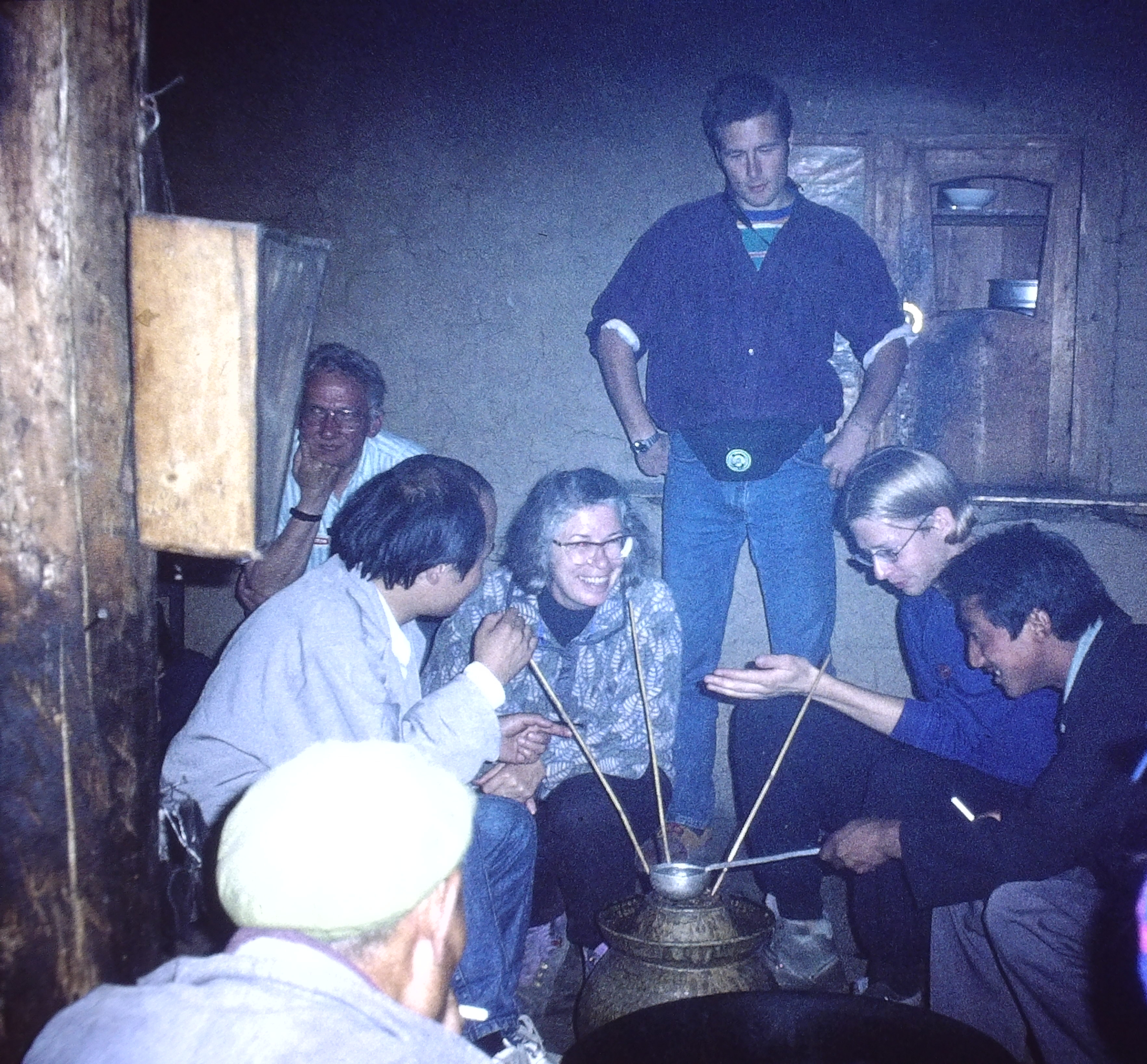 Den andra minnesvärda händelsen var en skördefest. Den råkade infalla en av dagarna vi var i byn och hölls i det större rummet hos vår värdfamilj. Om det serverades mat kommer jag inte så väl ihåg men annat minns jag desto bättre. En stor mackapär placerades på golvet, den hade tre hål för sugrör och sprit hälldes i, sedan varmt vatten. Tre personer kunde sitta runt den samtidigt och jag var bland de första så det smakade ganska starkt av sprit. Efterhand fylldes det på med varmvatten så spriten blev utspädd. Jag kan tänka mig att spritkonsumtionen gjorde sitt till att stämningen var på topp. Tyvärr kunde ingen av kineserna engelska men det behövdes inte, vi hade en oerhört trevlig kväll ändå. De dansade sina danser där vi försökte hänga med så gott det gick, vilket framkallade många glada skratt. Sedan skulle vi bidra till kulturutbytet och vi sjöng Vem kan segla förutan vind och Vi äro musikanter eftersom alla i gruppen kunde orden till de sångerna. Det är en kväll jag aldrig kommer att glömma.