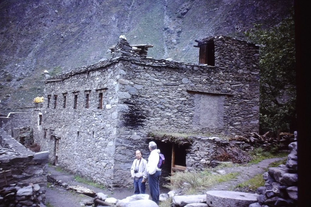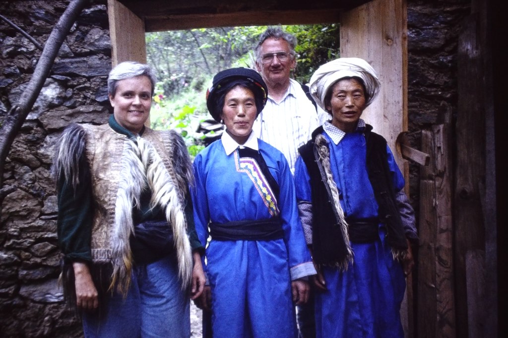 Stigen tog slut vid en by som låg vid foten av ett ganska högt berg. Den enda människa vi såg var en ung kille som höll på att arbeta på ett majsfält och när vi, via Chen Pei, började prata med honom bjöd han genast hem oss. Huset låg en bit uppför bergssidan så det blev en brant promenad. Killens pappa var hemma, han hade skadat foten och kunde därför inte arbeta. En kort stund senare kom killens mamma och mormor (eller farmor) hem och vi blev bjudna på mat. Vad vi åt vet jag inte riktigt och ätpinnarna såg måttligt rena ut men ingen av oss blev dålig i magen efteråt. Vi fick veta att vi var de första utomstående (inklusive hankineser) som någonsin besökt byn. Det kändes som om vi hade hamnat vid världens ända. Kvinnorna i familjen broderade väskor på vitt tyg så vi köpte naturligtvis var sin sådan. Om jag inte minns fel fanns det faktiskt el, det hängde en naken glödlampa i taket, men elen fanns nog bara på kvällarna.